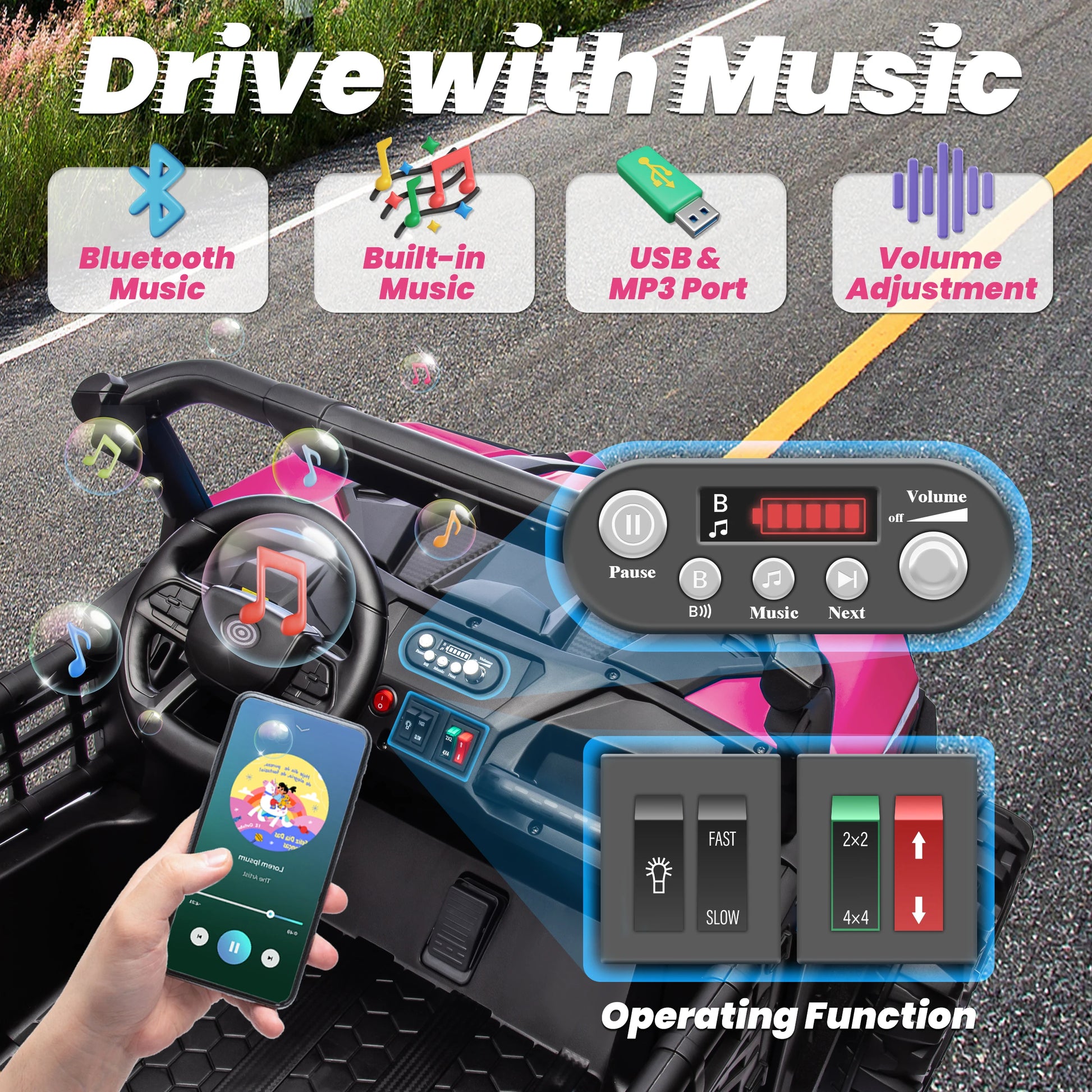 24V XL 2 Seater Car for Girls, 2WD/4WD Switchable Off-Road UTV w/Long-Endurance Battery Power, 3-Speed Remote Controller